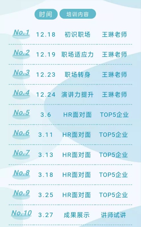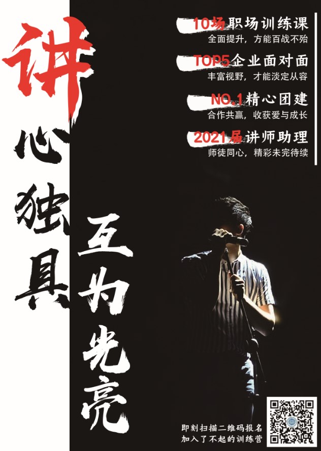 为第七届学生讲师们精心打造的“了不起的训练营”已经启动招募。“了不起的训练营”围绕职场关键内容定制了10场精心准备的职前训练培训,邀请职规名师和顶级名企HR为讲师们进行待入职场前的全面培训,让未来的职场新人们初识职场规则,学习职场高效沟通的方法,提高自我管理能力,完成心理上的角色转变。讲师也将投票选出职场准新人最想接触的企业前五名,邀请其资深HR进行面对面座谈,为讲师和企业打造专属线下交流平台,答疑解惑,提前开始入职必备技能学习,赢在职业生涯的起跑线上。