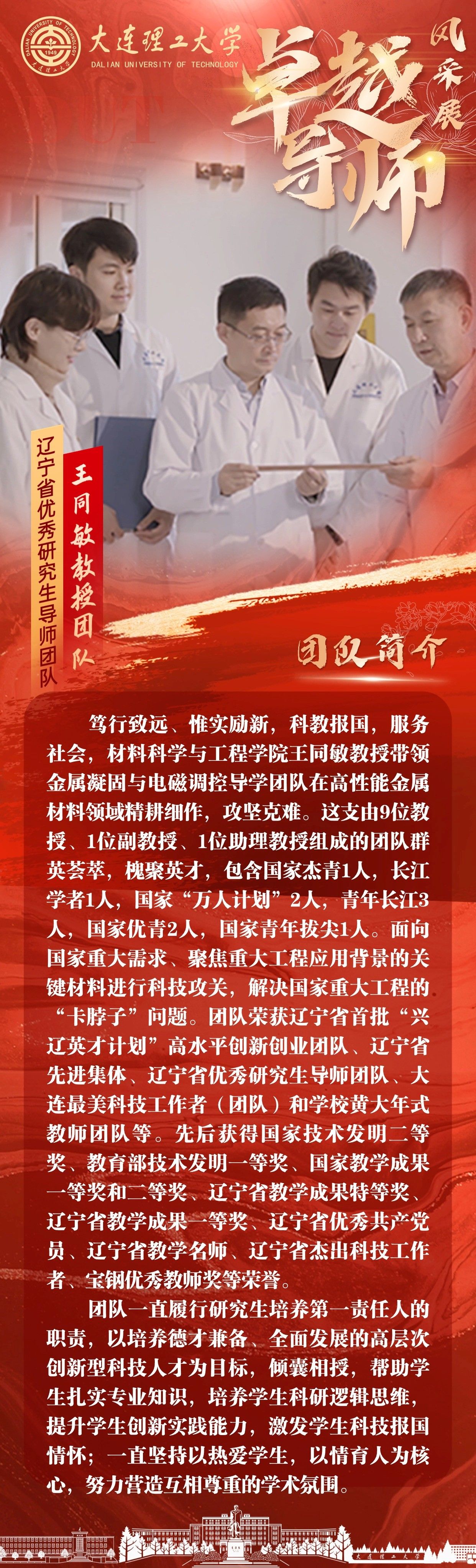 笃行致远、惟实励新,科教报国,服务社会,材料科学与工程学院王同敏教授带领金属凝固与电磁调控导学团队在高性能金属材料领域精耕细作,攻坚克难。这支由9位教授、1位副教授和1位助理教授组成的团队群英荟然,槐聚英才,包含国家杰青1人,长江学者1人,国家“万人计划”2人,青年长江3人,国家优青2人,国家青年拔尖1人。面向国家重大需求、聚焦重大工程应用背景的关键材料进行科技攻关,解决国家重大工程的“卡脖子”问题。团队荣获辽宁省首批“兴辽英才计划”高水平创新创业团队、辽宁省先进集体、辽宁省优秀研究生导师团队、大连最美科技工作者(团队)和学校黄大年式教师团队等。先后获得国家技术发明二等奖、教育部技术发明一等奖、国家教学成果一等奖和二等奖、辽宁省教学成果特等奖、辽宁省教学成果一等奖、辽宁省优秀共产党员、辽宁省教学名师、辽宁省杰出科技工作者、宝钢优秀教师奖等荣誉。
