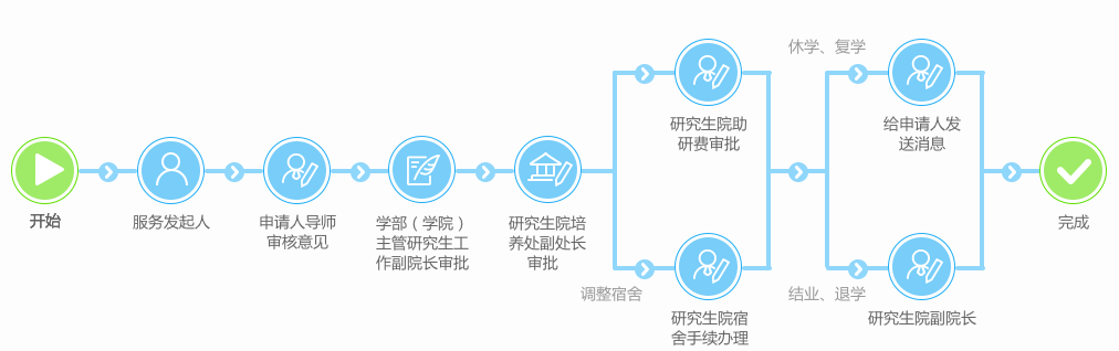 为减少师生不必要的填单子、跑腿签字和盖章,充分发挥学校网上办事大厅的功能,方便师生办理日常业务,提升效率,研究生院将“研究生学籍异动”等业务工作流程进行了优化,并调整为线上办理。具体内容如下。