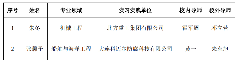 近日,全国工程专业学位研究生教育指导委员会公布了“工程硕士实习实践优秀成果获得者”荣誉称号的名单,经过校内组织推荐、教指委评审,我校2015级机械工程领域研究生朱冬和船舶与海洋工程领域研究生张馨予获评。本次共有来自全国64所高校的115名毕业生获此称号。