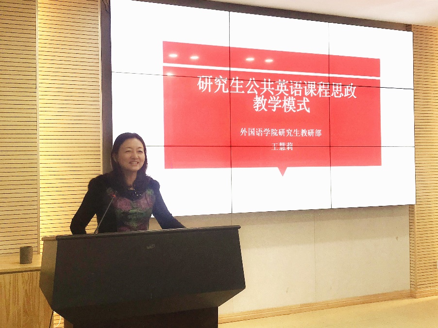 王慧莉教授以《研究生公共英语课程思政教学模式》为题,从“课程思政的基本概念与理论指导”、“教学目标定位”、“将‘四个统一’融入课程教学相关环节、以德立身、以德立学、以德施教”和“思政元素融入教学模式”四个方面,以《国际学术会议交流英语》课程为例,为大家介绍了自己在建设研究生课程思政示范课程中的心得。她指出“要把汉语和英语的特点都为学生们讲清楚,要从语言与文化之间的关系树立文化自信”。关于“外语课程中的课程思政育人”,她着重提出“关于教与学,应当遵循习近平总书记提出的‘可以借鉴国外有益做法,但必须扎根中国大地办教学’,教育与受教育都是为了未来。”王慧莉还分享了指导学生研读《平易近人——习近平的语言力量》中英文版的经验。
