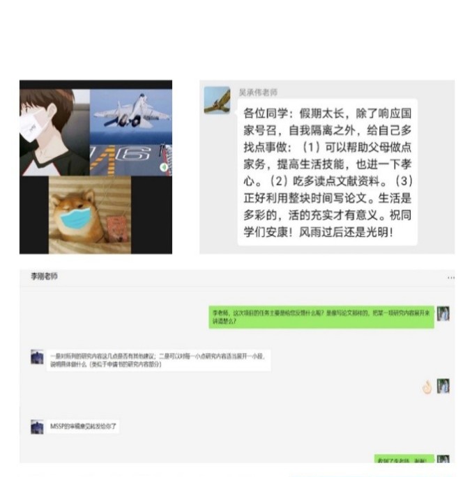 虽然开学延期,老师们仍心系科研,或梳理总结科研成果,或认真筹划相关科研项目的申请,或投入到论文等的发表工作上。研究生导师通过微信、QQ、电话、邮件和钉钉等多种方式,与学生们保持密切沟通,结合实际情况布置任务、推进进度,要求学生定期汇报成果,以线上的方式对学生的研究内容进行检查与指导。如“973”首席科学家李刚部长线上指导研究生进行筹备科研项目的相关工作,把握学生科研进度并提供修改意见;力学博士点副点长吴承伟老师在疫情期间不光关心学生们的科研进度、论文进展,还关注学生们生活及综合素质的提升。