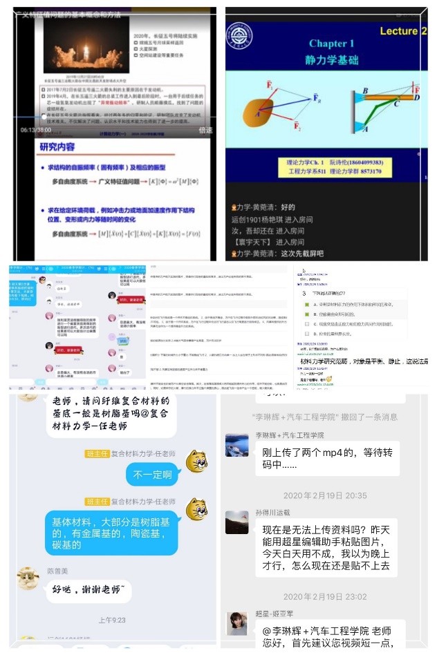 在这个特殊时期,老师和同学们虽然身处各地,运载学部教务办按照学校要求积极进行组织、各教学院长、教学秘书通过微信、QQ、邮件等为老师和同学建立联系,发布研究生院在线教学通知、授课平台培训通知、学生入群通知等,进行选课咨询等。任课教师组建课程QQ群和微信群辅助课堂,学部还成立研究生线上课程讨论组分享线上授课经验…… 虽然隔着屏幕,但我们的联络不间断,全力做好教学的后勤保障工作。