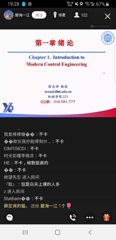“徐志祥教授的现代控制工程课程,在开课之前就反复实验,确定了能达到最好效果的线上授课模式。上课初始,徐老师表达了对武汉疫情的关心和希望疫情早日结束的期望。接下来的授课过程更是把我们带入了知识的海洋,扩展了我们的视野。徐老师还在视频中演示了生活中的趣味实验,生动形象的描述了控制工程中的一些原理意义,加深了我们对控制工程的理解。”机械学院19级研究生马腾参加了在线课程学习后这样说。