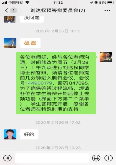 为了不耽误博士生毕业,我院根据研究生院的精神,申请预答辩或答辩环节采用网审方式;预答辩和论文答辩环节采用网络视频方式正常进行。2月28日上午9时,我院王同敏教授的学生刘达权采用视频进行了预答辩,是我校疫情以来首例尝试使用视频进行预答辩的博士生,长达两个半小时的预答辩过程有条不紊。作为首次尝试,为了确保效果,王同敏教授和同组康慧君副教授在正式线上预答辩前做了很多准备工作。首先借鉴学校在线课程的经验,最终选择了腾讯会议APP和EV录屏软件;而后,课题组教师利用两款软件进行预答辩预演。预演中发现当共享屏幕和视频同时显示时,会导致PPT播放卡顿,关闭视频后整个预答辩过程进行顺利;最后,根据预演效果总结规定了正式线上预答辩的流程,并制定通过微信沟通等办法拟补不足的措施。目前来看,线上预答辩并没有降低对博士生的要求,反而因为全程录屏,答辩同学可以通过反复收看视频,回顾评审老师提出的每条意见和建议,对大论文的修改起到巨大帮助作用。