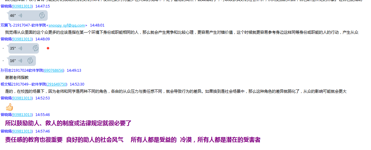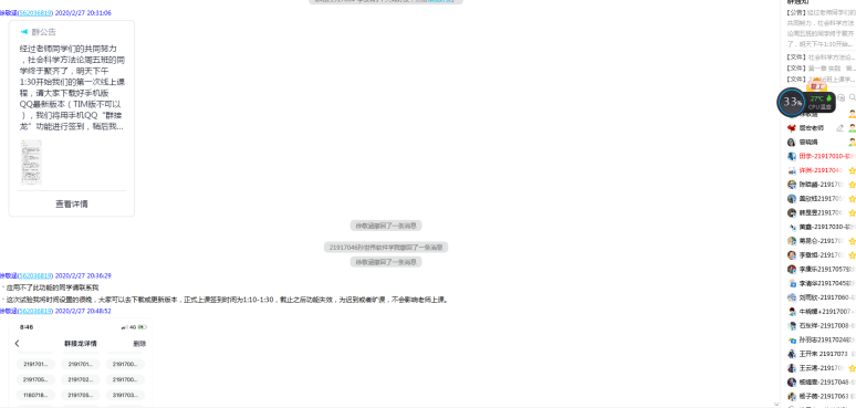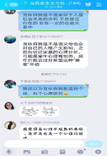 马克思主义学院曾晓娟教授、陈晓晖教授、刘志礼教授和滕国鹏副教授所组成的主讲教师团队,利用超星学习通和QQ群两个平台,采用“速课学习——文献阅读——师生讨论——老师点评与总结”的教学方式进行授课。为了做好线上教学,春节期间课程组的老师已经开始备课、建课和录速课,并积极与选课学生建立联系,及时引导学生加入课程群。开课前课程组积极参加了各类网络教学的培训,努力掌握新技术的应用方法,提升上课技能。开课后,课程负责人曾老师课上首先提出任务与要求,同学们则围绕课程重点内容开展线上学习,然后老师引导抛出讨论问题,比如 “一切从实际出发、具体问题具体分析”的方法论,曾老师就结合疫情防控期间各地出现的“硬核标语”展开热烈讨论,第一周课的很多选题都与当前的防疫问题进行了充分结合,调动了同学们学习热情和参与讨论的积极性。讨论后,教师进行点评、答疑和课程总结。同学们在收获理论知识的同时,也获得了很多指导学习和成长的人生智慧。