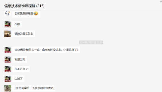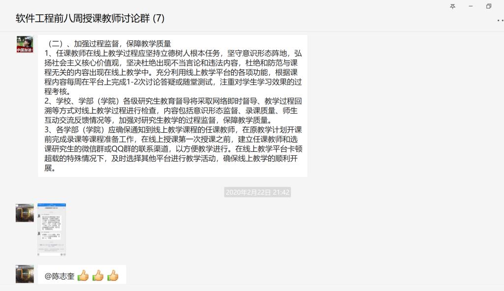 疫情当前,校区上下攻坚克难,教师们积极参与。为了确保原定2月24日开学之后的9门次课程通过“在线教学”的方式如期开课,软件学院研究生培养办做了精心准备。复学前夕,通过建立前八周授课教师群,与各位授课教师一对一沟通。群内,大家共同出谋划策,相互借鉴学习。为了保证课程有效且高质量地进行,教师们提前为每门课程建立了与学生的沟通群。