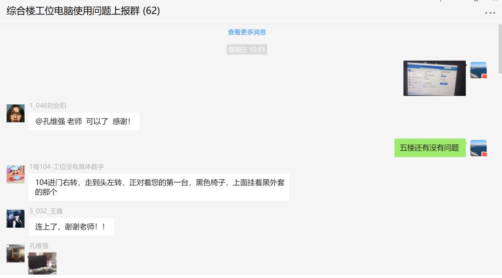 与本科生不同,研究生除课程学习外,还有科研任务,尤其是马上面临毕业论文提交的应届博士生和硕士生。研究生培养办考虑到有些学生的实验数据以及相关论文保存在实验室的电脑里,但是由于无法进入校区,学生无法获取到资料,导致影响科研进度。因此,培养办在研究生群里对该类学生的情况进行了详细的统计。在学院党委和校区总务的支持下,培养办派出专职教师驱车从市内赶到开发区校区,与校区总务潘老师一同为学生启动电脑、安装远程软件,使得学生在家就可访问实验室电脑并获取数据,保障了研究生科研任务的顺利开展。