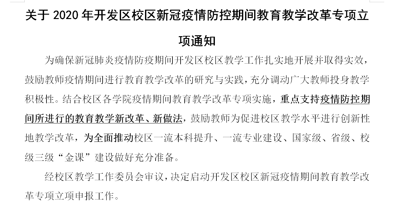 与此同时,为了确保新冠肺炎疫情防疫期间开发区校区教学工作的扎实开展并取得实效,开发区校区和软件学院先后启动疫情期间特殊教改,鼓励教师在疫情期间进行教育教学改革的研究与实践,充分调动广大教师的教学积极性。