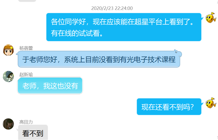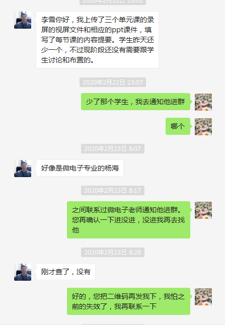 为确保教师和学生适应线上教学新模式,学院研究生工作组早早开始复工工作,利用微信通知并组织教师进行超星学习通、爱课程、学堂在线、智慧树等网络平台授课培训。学院共有12门研究生课程,其中第一周开课并采取线上教学的有2门,在 2月18日2位主讲老师便建立好QQ群、微信群,通知全部学生进入课程群了解在线学习相关信息。