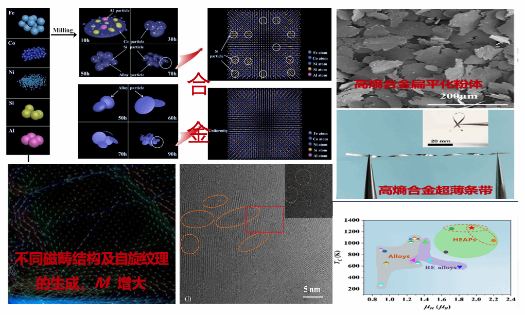 (1)高磁导率高熵合金新型电子信息材料:设计制备低矫顽力和高磁导率的高熵合金磁性材料,用于电磁兼容、电子信息、磁记录、通信、新能源汽车、磁屏蔽、电磁波吸收等领域。具体从多元素协同及纳米晶微结构可控设计制备新型高磁导率高熵合金粉体或超薄条带,实现磁导率的多频谱有效调控,应用于信息存储和传输、电磁屏蔽、电磁波吸收等领域。