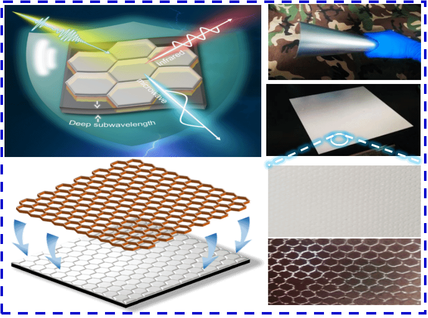 (3)雷达/红外兼容隐身超构吸波材料:提出“通低频阻高频”仿生超结构,形成“表层红外+底层雷达”复合超结构,实现雷达/红外兼容隐身。红外发射率降低的同时保持雷达波的高透射率,底层吸波性能仍保持原有特性,达到国内领先水平。