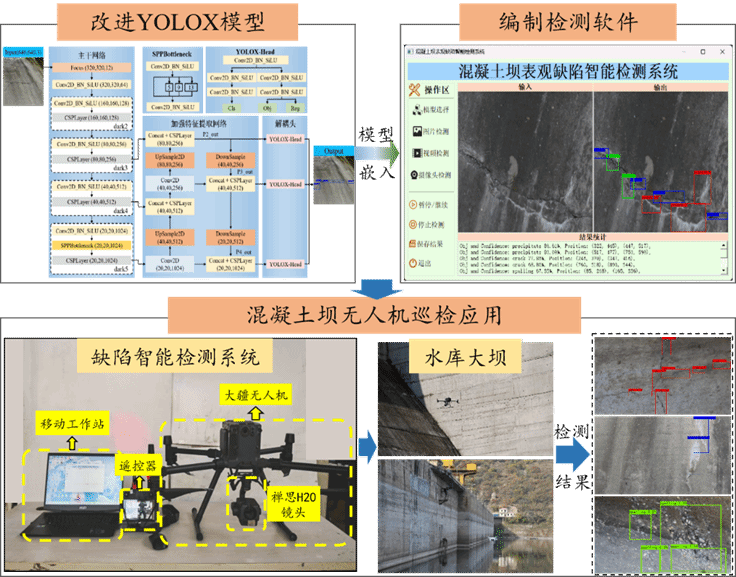 二、基于无人机与机器视觉的混凝土坝智能巡检技术研究。针对混凝土坝表观缺陷背景复杂、边界模糊、不同缺陷尺寸差异大等问题,提出了一种基于改进YOLOX模型的多类型缺陷智能检测方法,提高了检测无人机采集的复杂背景的混凝土坝表观缺陷图像的鲁棒性。基于无人机和机器视觉,提出了适用于混凝土坝常规巡检和应急检测的实景三维模型重建方法,为表观缺陷的全面展示和三维定位提供了基础依据。已用于多座大坝进行三维模型重建以及缺陷检测任务,为大坝水上表观缺陷巡检提供了理论基础和解决方案。