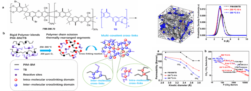 以热能为驱动力的传统工业分离过程(如蒸馏)成本贵、能耗高、体积大,膜分离是一种新型高效分离技术,可有效克服传统分离技术的挑战,缓解全球日益紧张的能源危机,有助于我国实现“碳达峰、碳中和”目标。传统聚合物膜材料存在渗透性-选择性之间此消彼长的tradeoff关系(即Robeson上限),严重制约了膜技术的发展与应用。课题组提出了通过聚合物共聚多重共价交联机制调控膜孔径的策略,制备了孔径在3.5-4 Å间的微孔聚合物,实现了对多种气体的精确、高效筛分,突破2019年气体分离上限(Nat. Commun. 2021, 12, 6140)。
