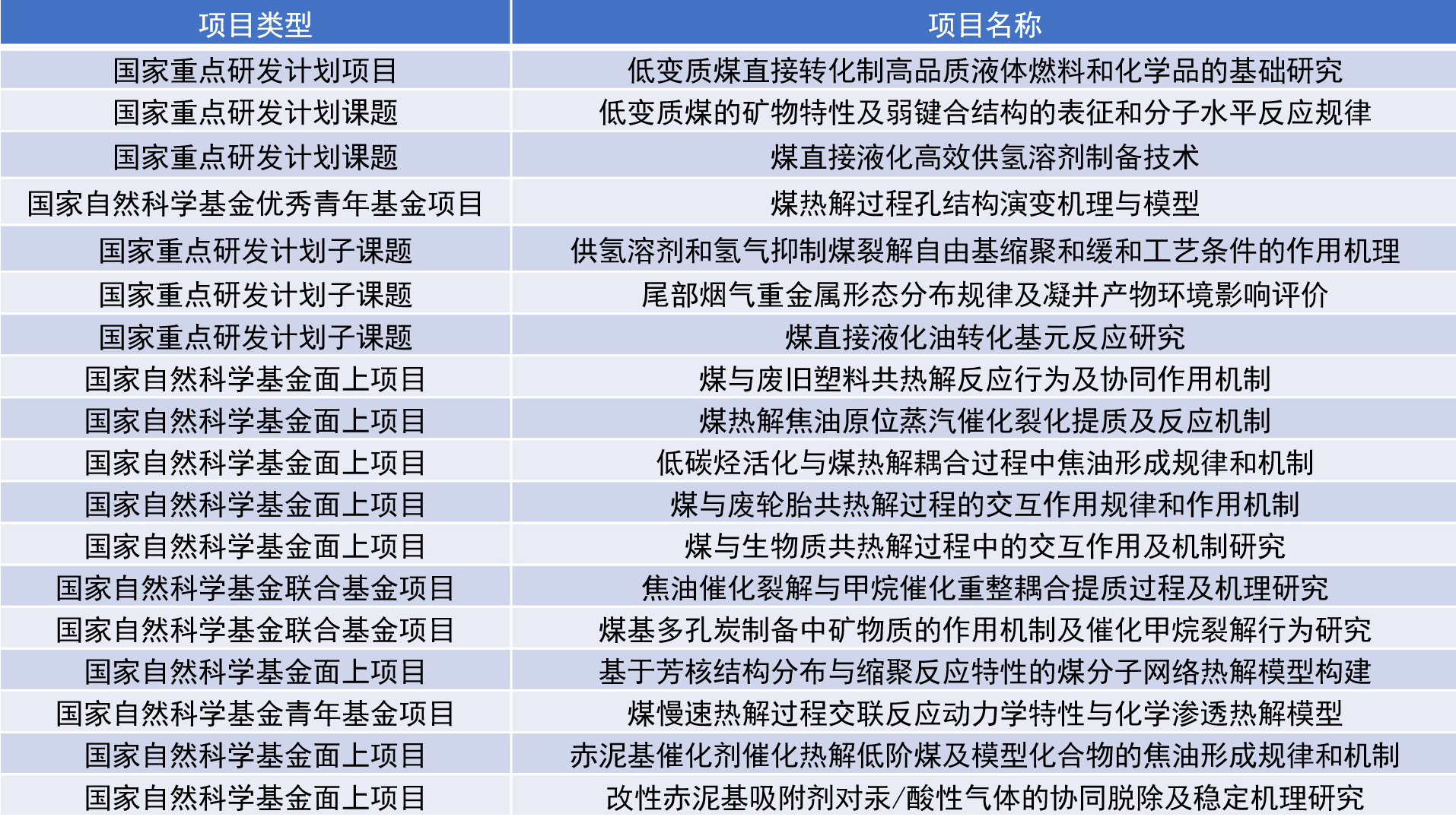 煤炭清洁高效利用团队长期从事煤转化基础研究,先后承担国家重点研发计划项目、国家重点基础研究发展计划(973 计划)、国家高技术研究发展计划(863 计划)、国家自然科学基金重点项目、国家自然科学基金优秀青年基金项目以及国家自然科学基金面上项目等多项科研任务。近年承担的主要科研项目: