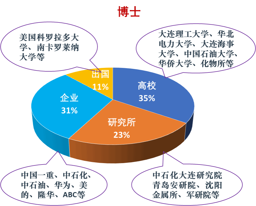 团队培养硕士、博士毕业生200余人,研究生多人次获得过国家奖学金、优秀研究生、国际学术会议最佳报告奖、最佳海报奖等,毕业生就业率百分之百。近五年的博士毕业生平均年薪达50万以上,35%毕业生于双一流高校任教、31%毕业生进入华为、美的、中石化、金发科技等世界五百强企业带领科研团队、23%进入中石化下属研究院、军研院等科研院所、另有部分毕业生出国深造。近五年的硕士毕业生平均年薪20万以上,深受中石化、陶氏、设计院等企业欢迎。