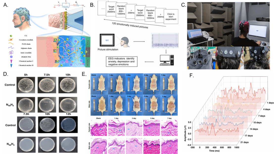 图5. 水凝胶电极的设计与表征、生物安全性测试以及连续21 天采集事件相关电位。
